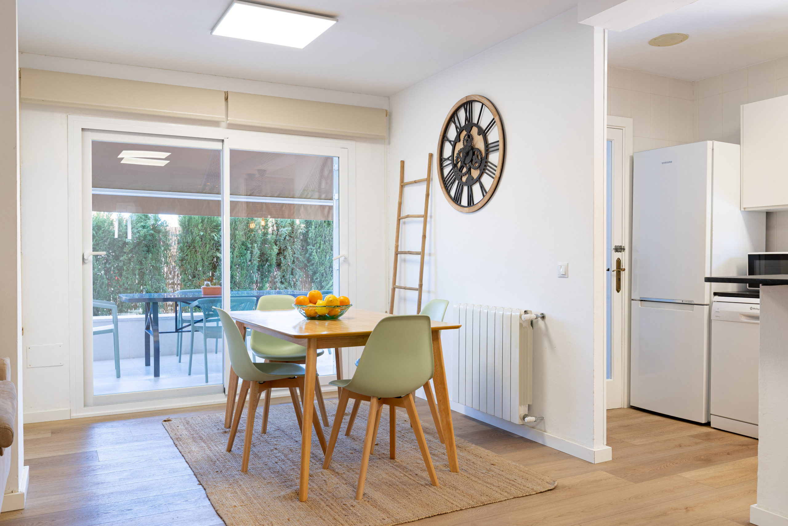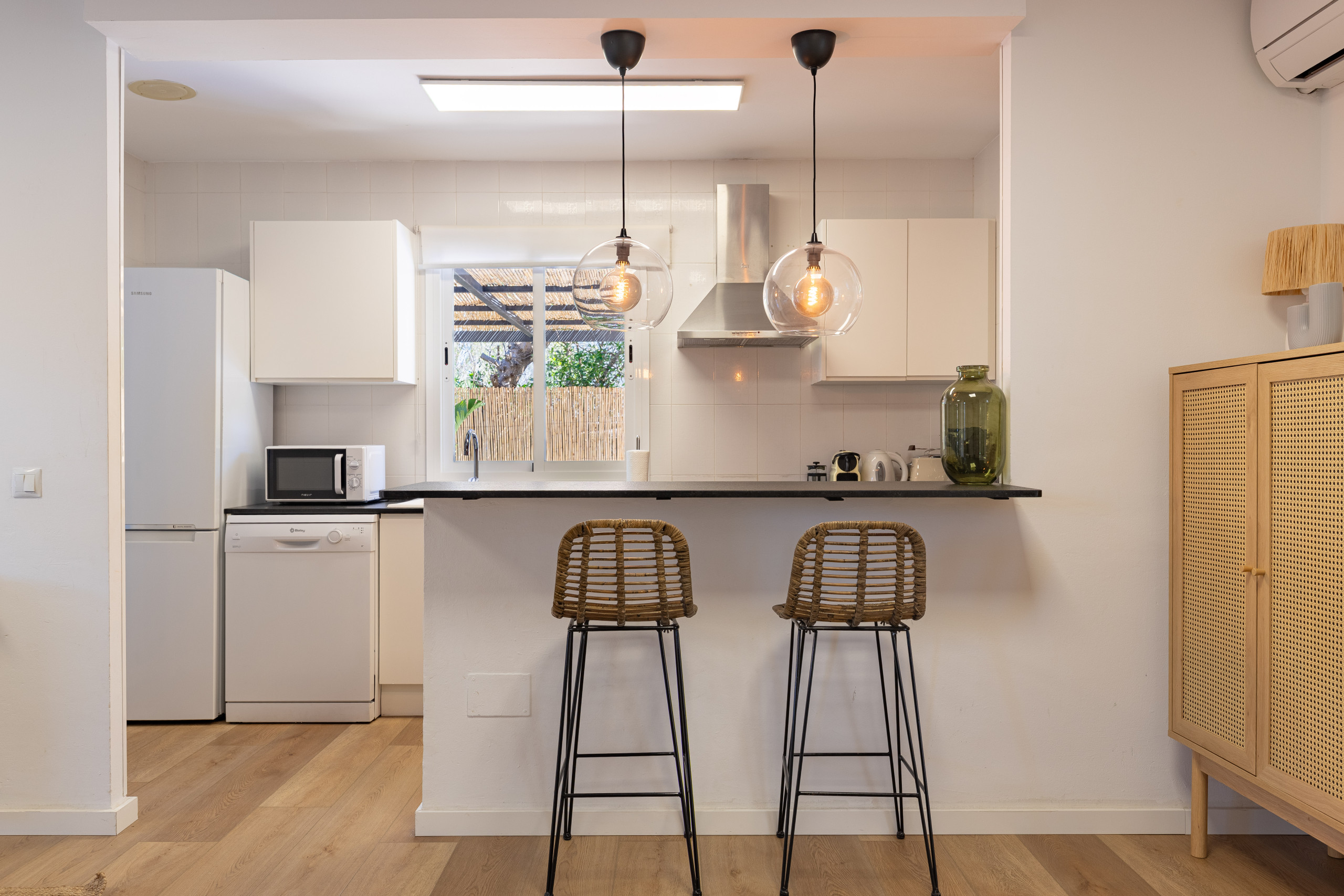 Beim Betreten des Hauses finden wir das Esszimmer mit einem großen Tisch und links die überdachte Terrasse, der ideale Ort, um zu jeder Tageszeit fröhliche Zusammenkünfte am großen Tisch zu feiern, wo man allerlei Köstlichkeiten genießen kann. Auf der rechten Seite bietet die gemütliche Küche alles, was ein Hobbykoch braucht, um ein gelungenes Abendessen zuzubereiten, es gibt sogar eine Frühstückstheke.