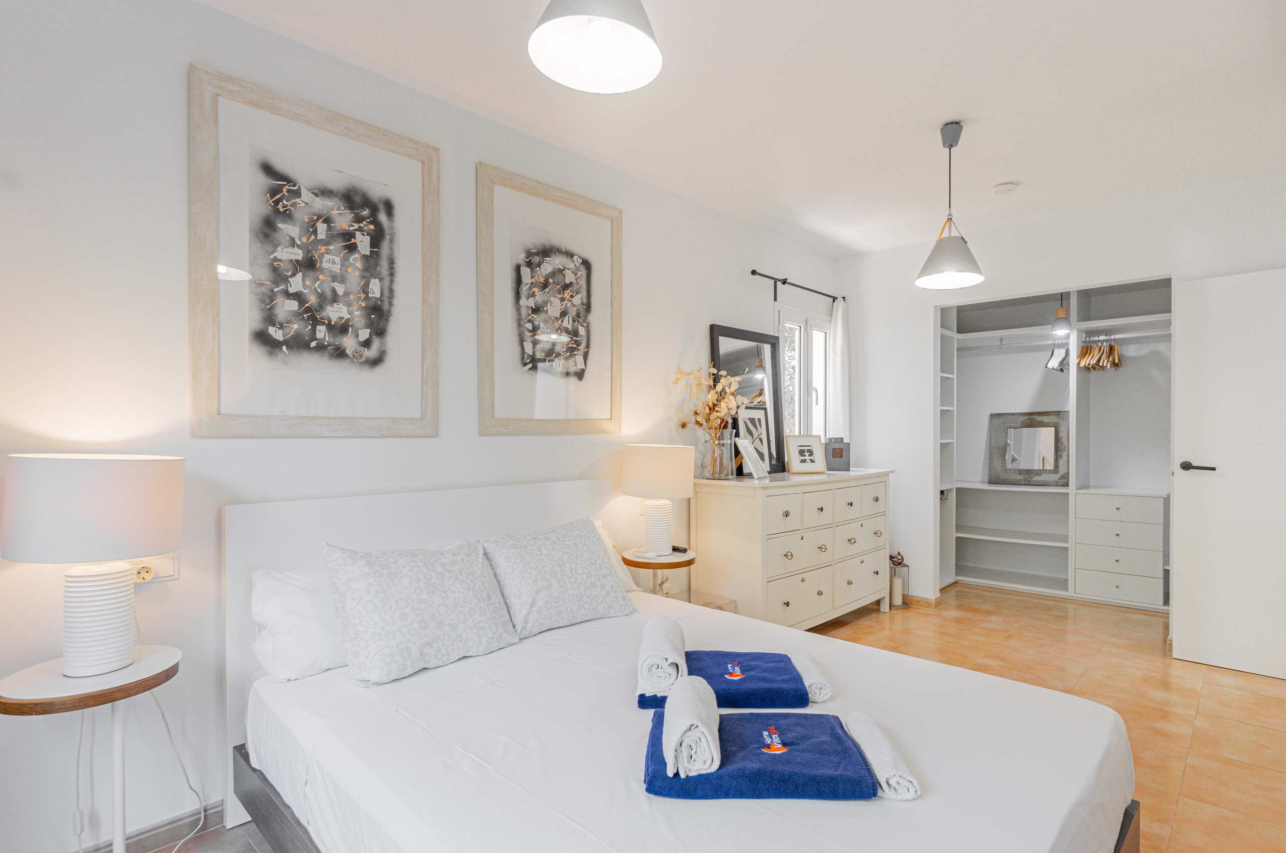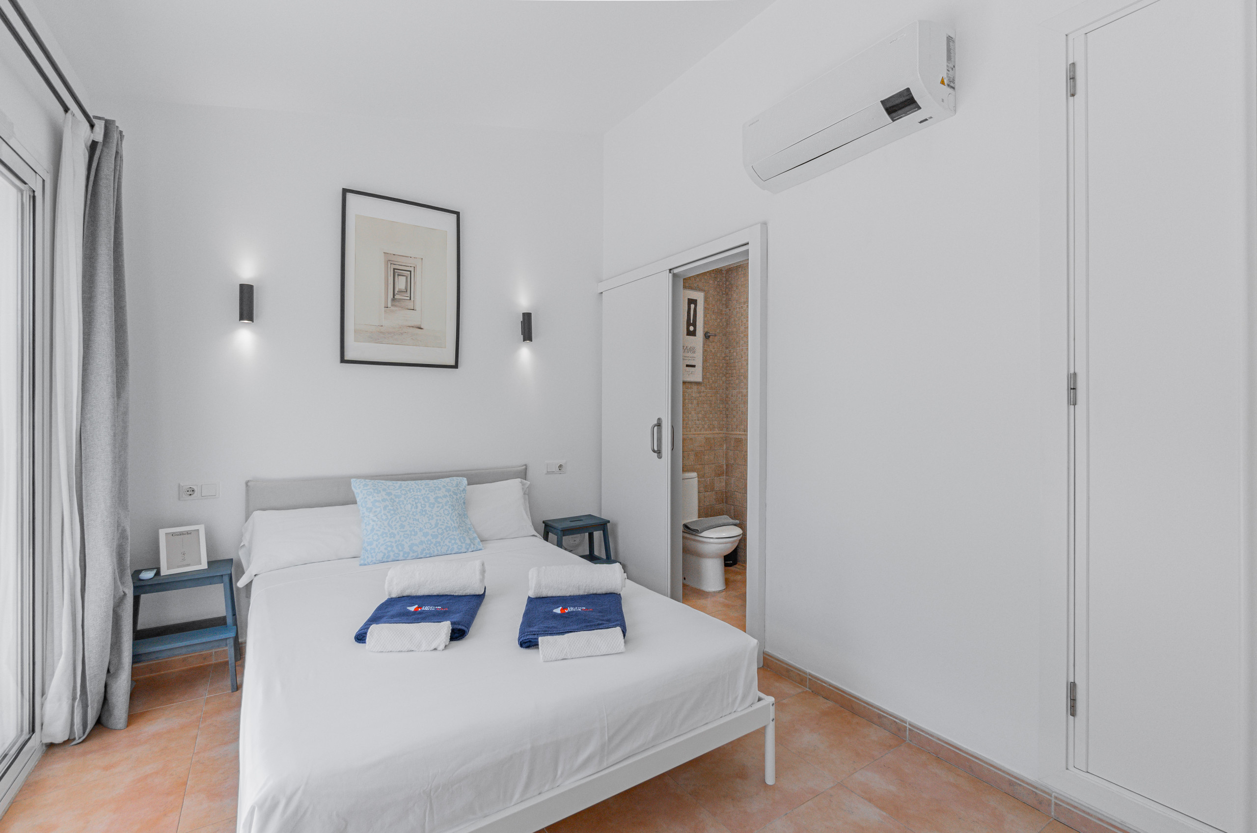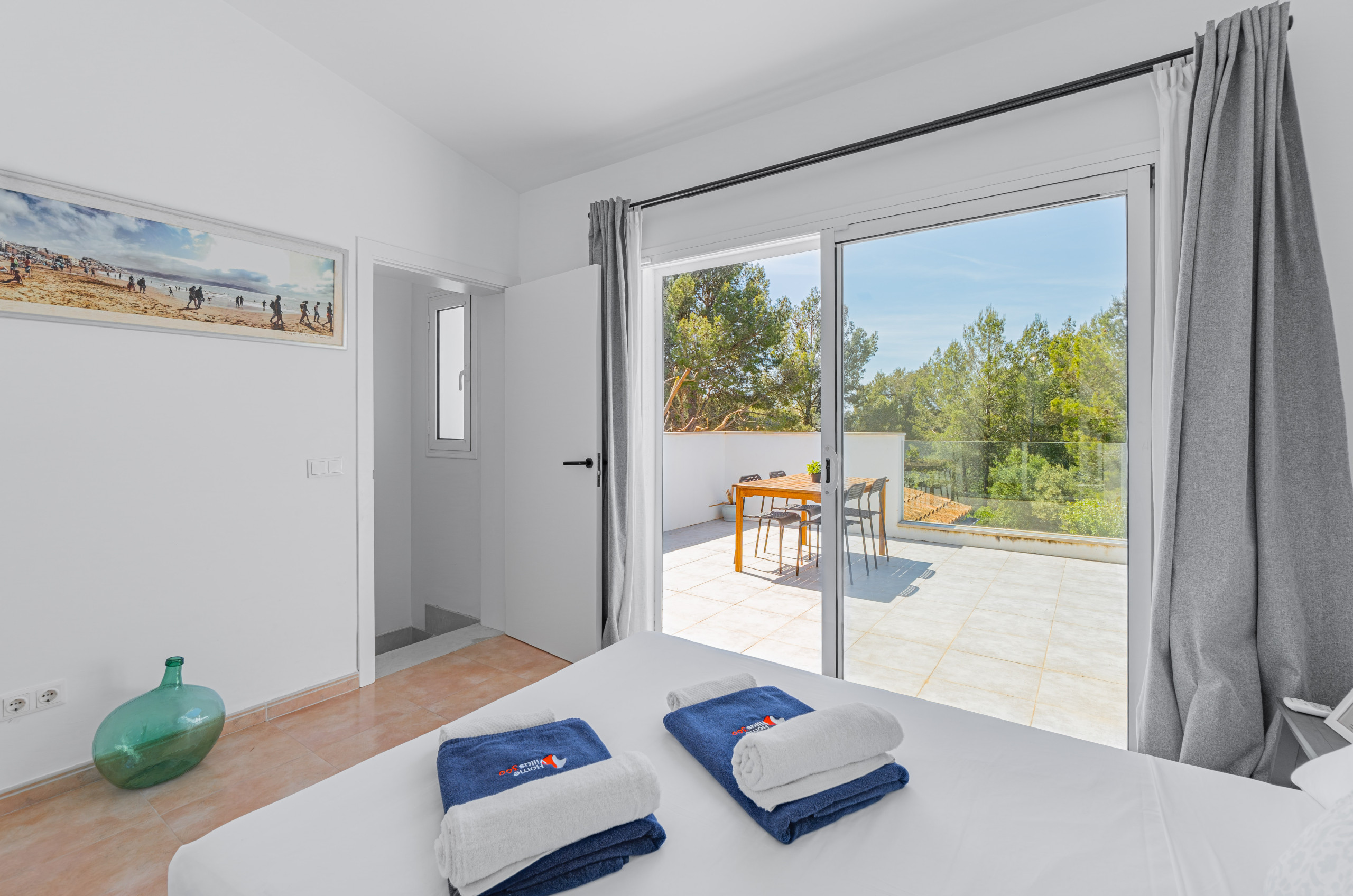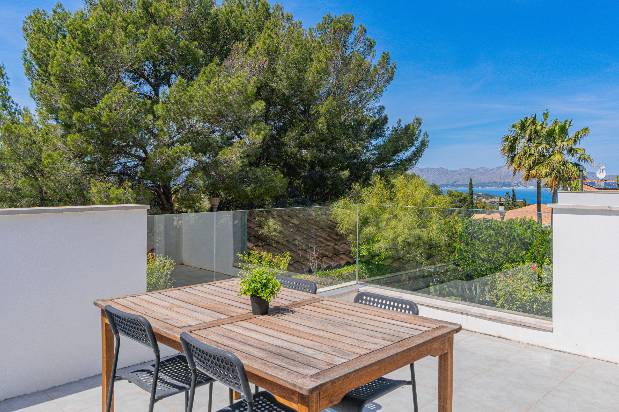 Im oberen Geschoss befindet sich das Hauptschlafzimmer mit einem Doppelbett. Dieses Schlafzimmer verfügt über ein eigenes Badezimmer (Dusche) und eine Terrasse mit Blick auf die Bucht von Puerto Pollensa. Ideal zum Genießen von Sonnenuntergängen und Sonnenuntergang.