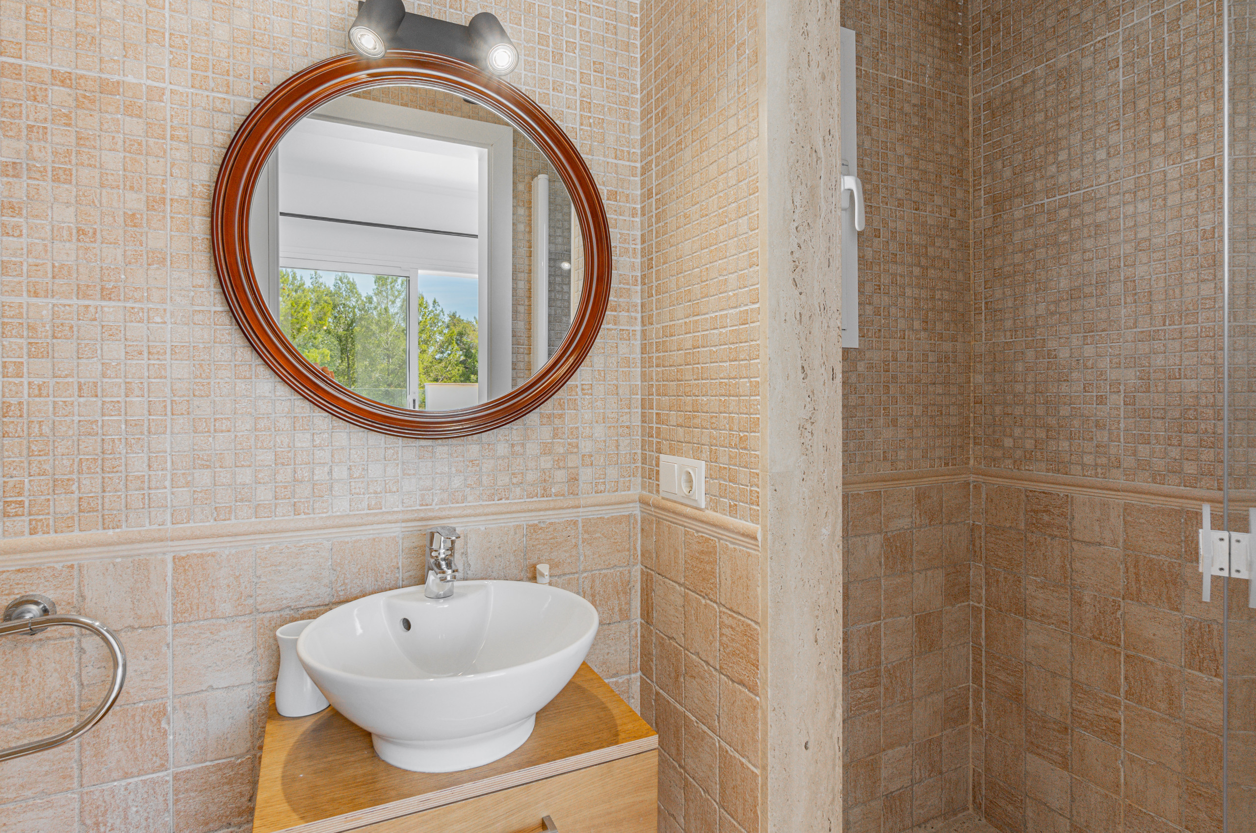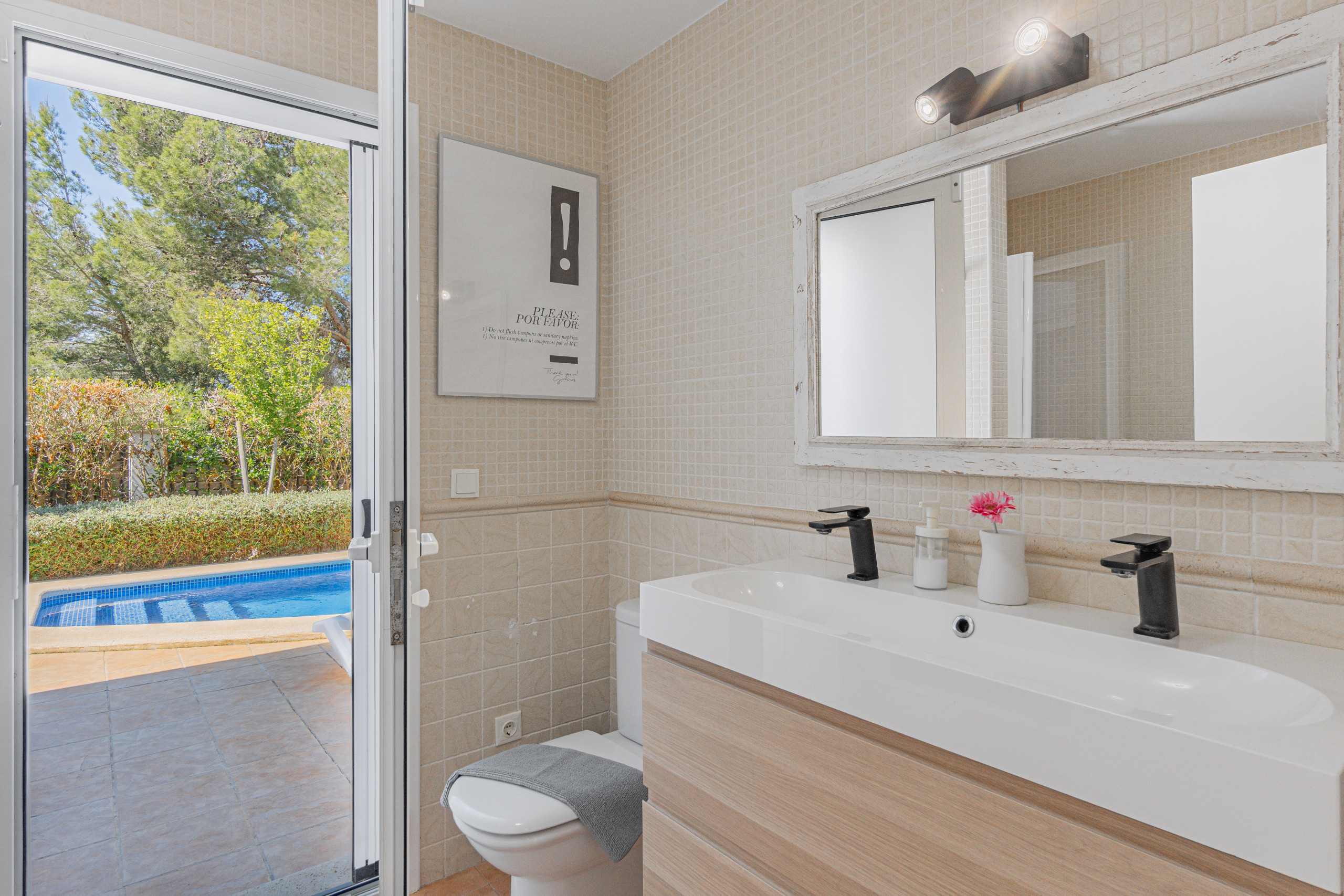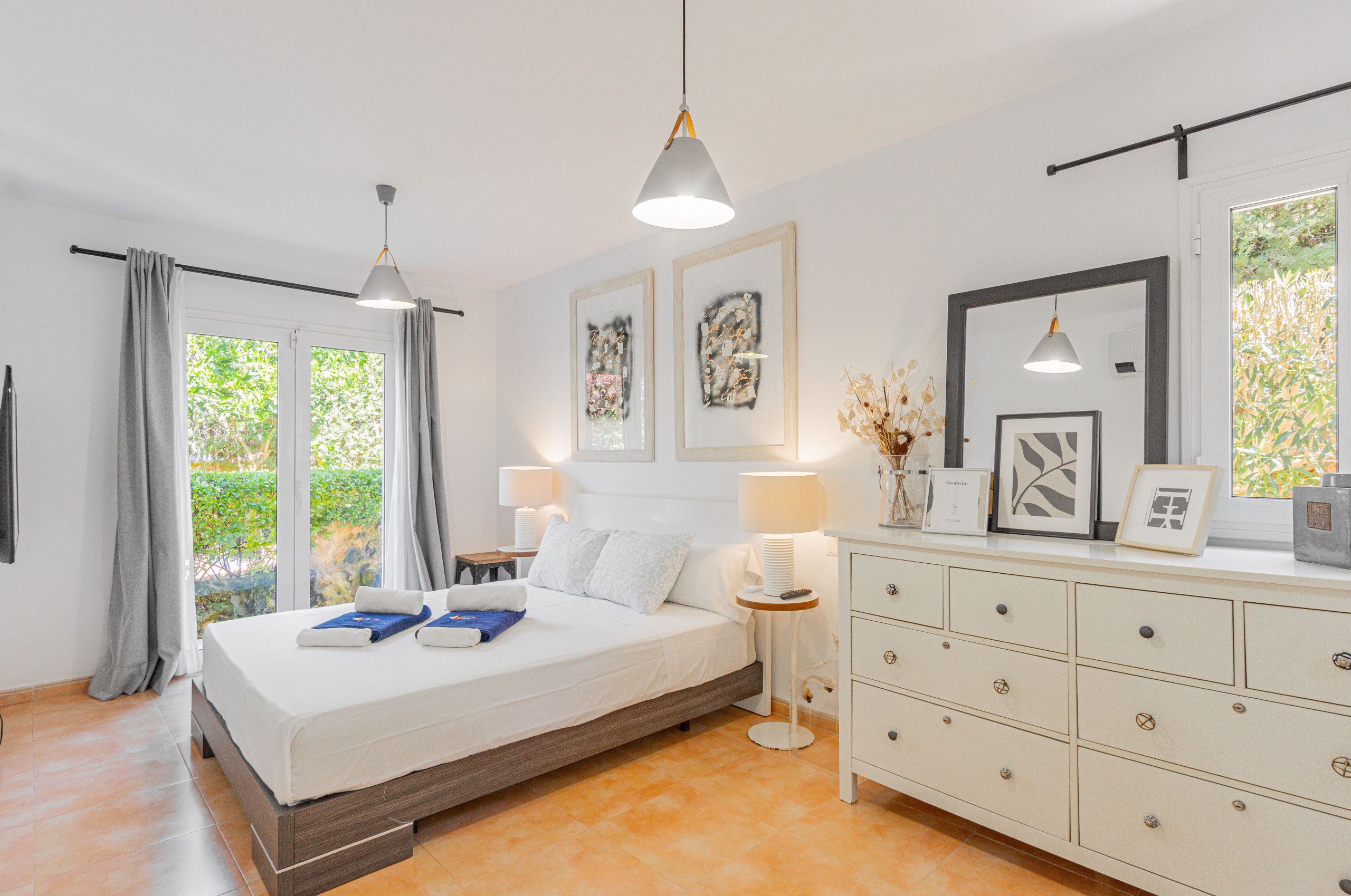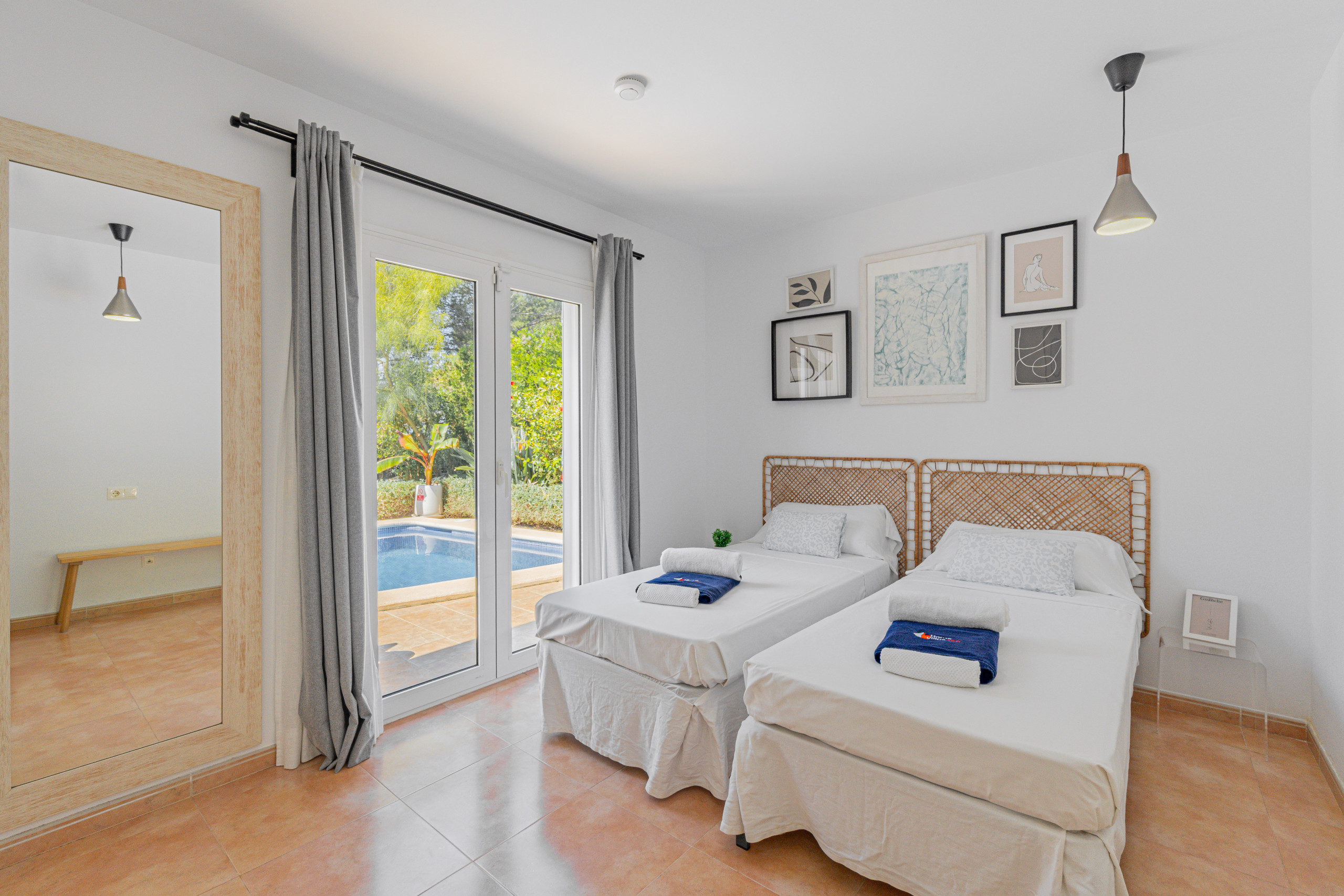 Im gleichen Erdgeschoss gibt es 2 Schlafzimmer. Ein Schlafzimmer mit Doppelbett und ein Schlafzimmer mit zwei Einzelbetten, zusammen mit dem Familienbadezimmer (Dusche). Beide Schlafzimmer haben direkten Zugang zum Außenbereich und zum Pool.