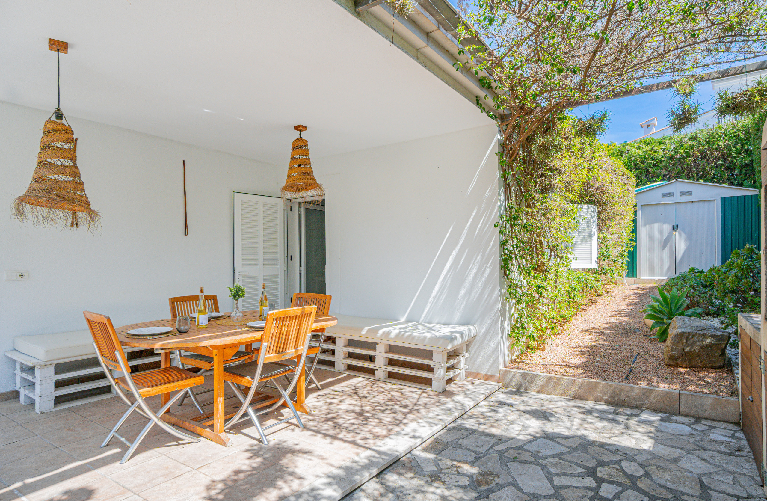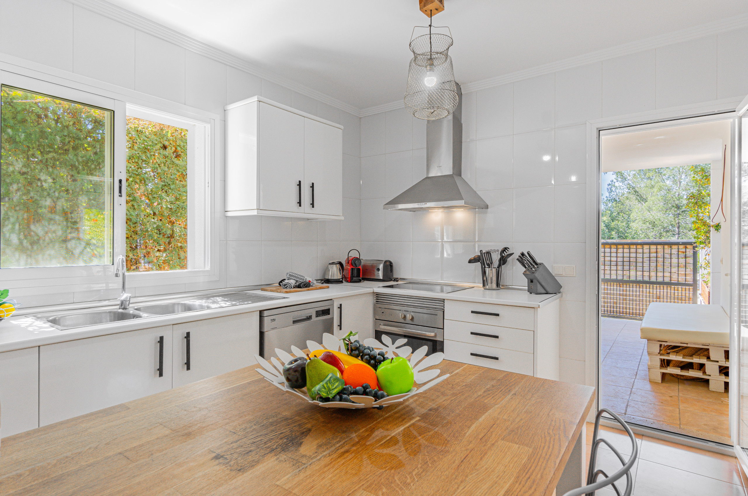 Im Erdgeschoss befindet sich eine geräumige, vollständig ausgestattete Küche mit Ofen, Geschirrspüler, Kochfeld, Geschirr/Besteck, Küchenutensilienset, Kaffeemaschine, Toaster, elektrischem Wasserkocher, Mikrowelle und Gefrierschrank. Die Küche verbindet sich mit einem komfortablen Wohn-Esszimmer, das viel natürliches Licht bietet, mit einem Wäschebereich (Waschmaschine und Bügeleisen) und mit einem Zugang zur überdachten Terrasse zum Essen im Freien.