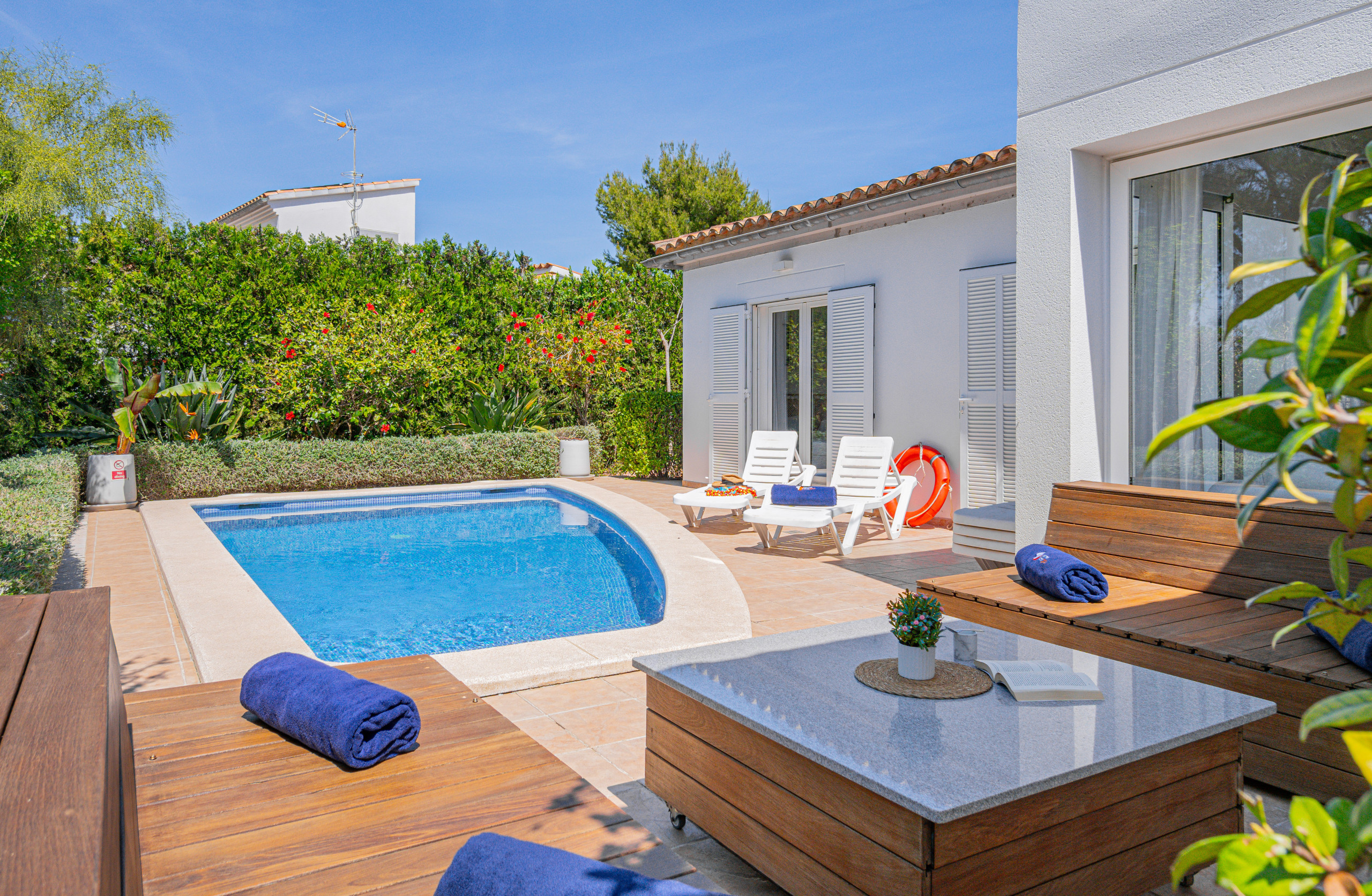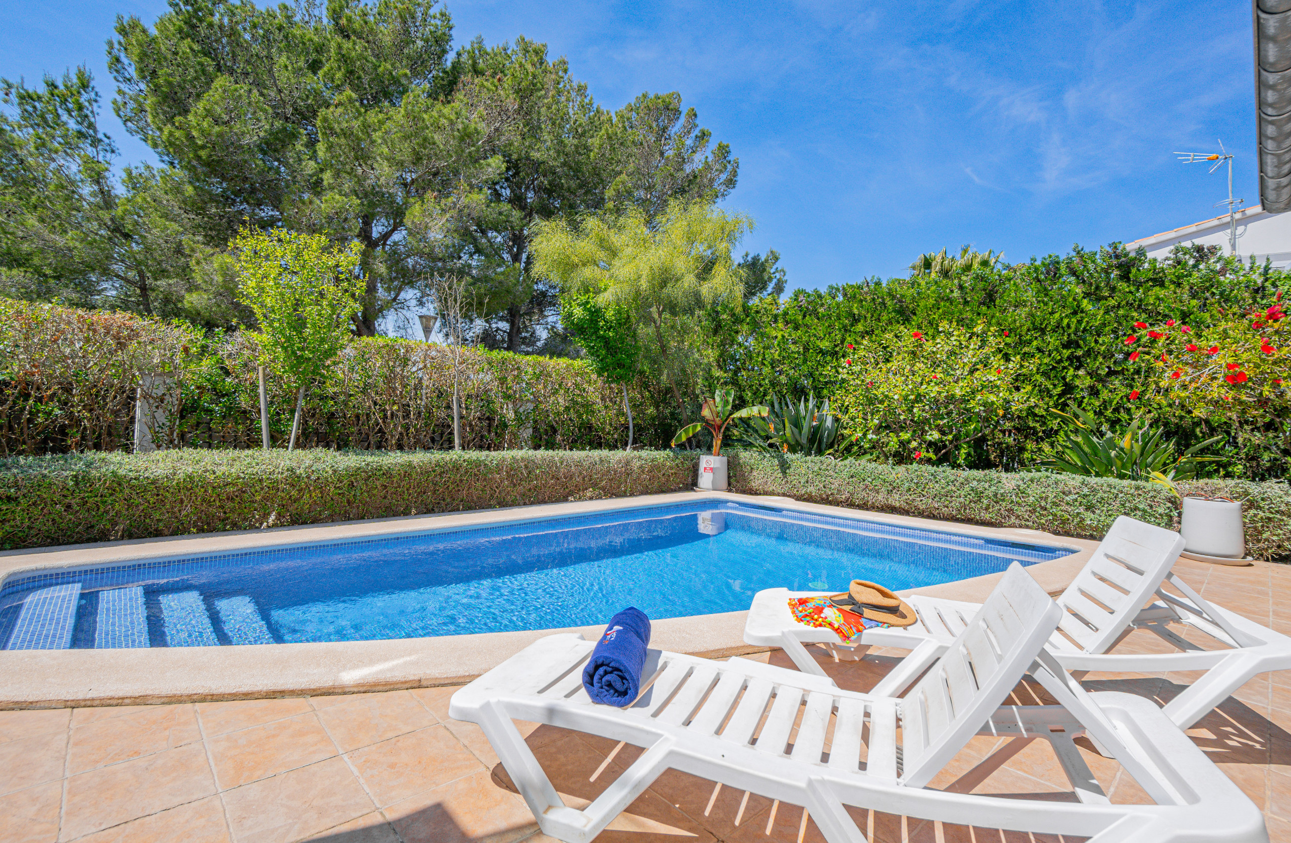 Die Unterkunft von 179m² bietet 3 Schlafzimmer auf 2 Etagen. Kostenloses Internet/WLAN. Villa für maximal 6 Gäste. Mindestalter der Gäste 26 Jahre, außer Familien. Möbliert und hell mit Garten, Swimmingpool, Grill und Klimaanlage.