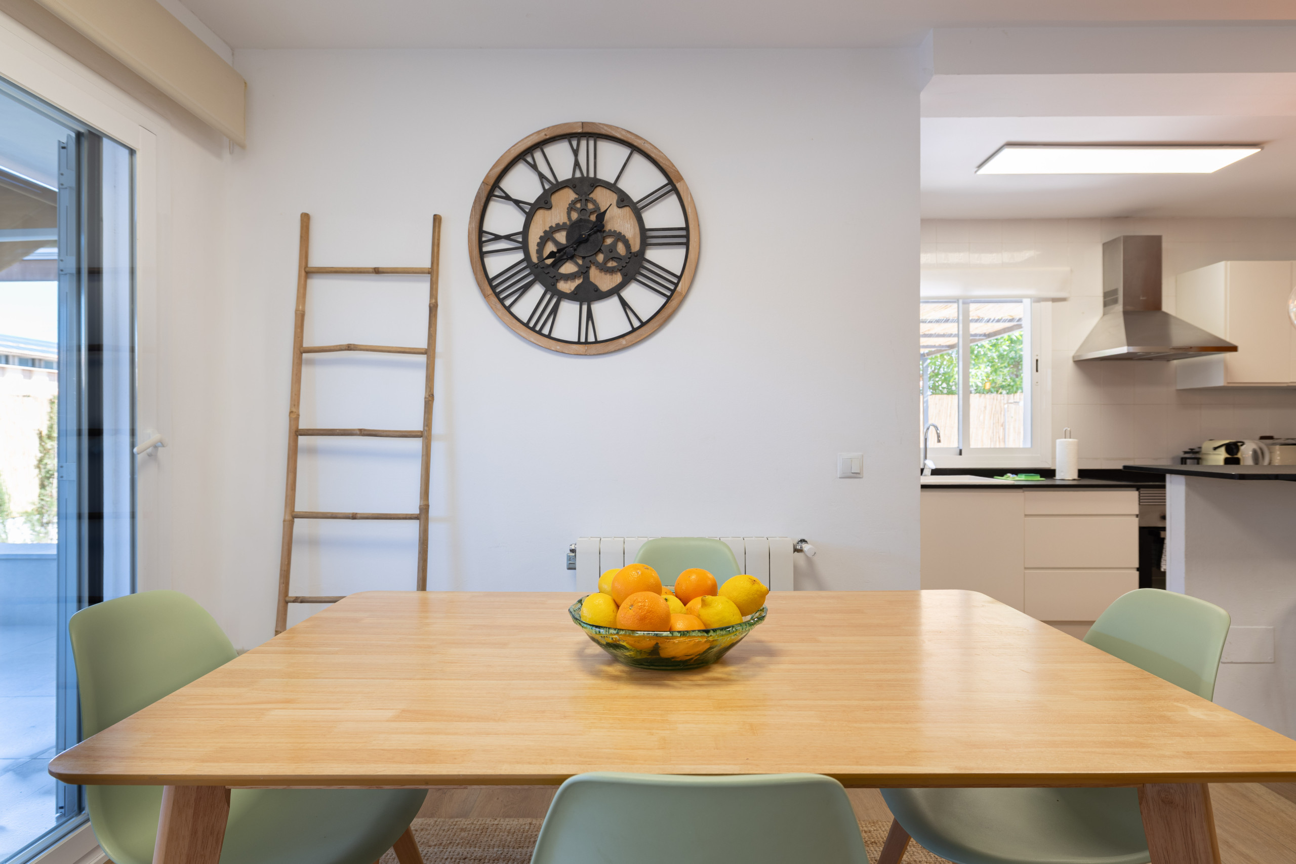 Al entrar, nos encontramos con el comedor, con una gran mesa y a la izquierda la terraza cubierta, el lugar ideal para celebrar alegres reuniones a cualquier hora del día en la gran mesa, donde podrán disfrutar de todo tipo de manjares. A la derecha, la acogedora cocina tiene todo lo que un chef aficionado necesita para preparar una cena con éxito, incluso hay barra de desayuno.