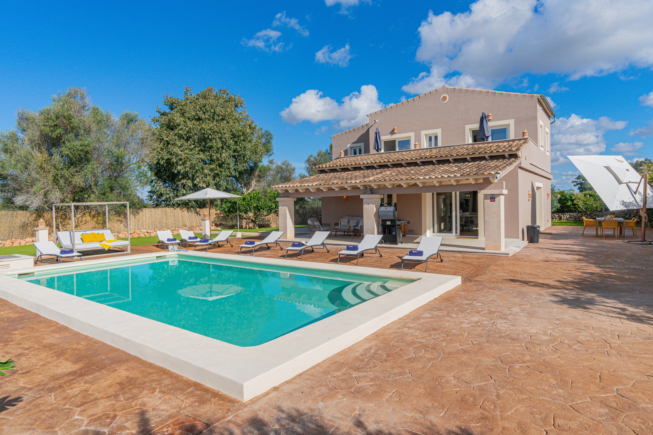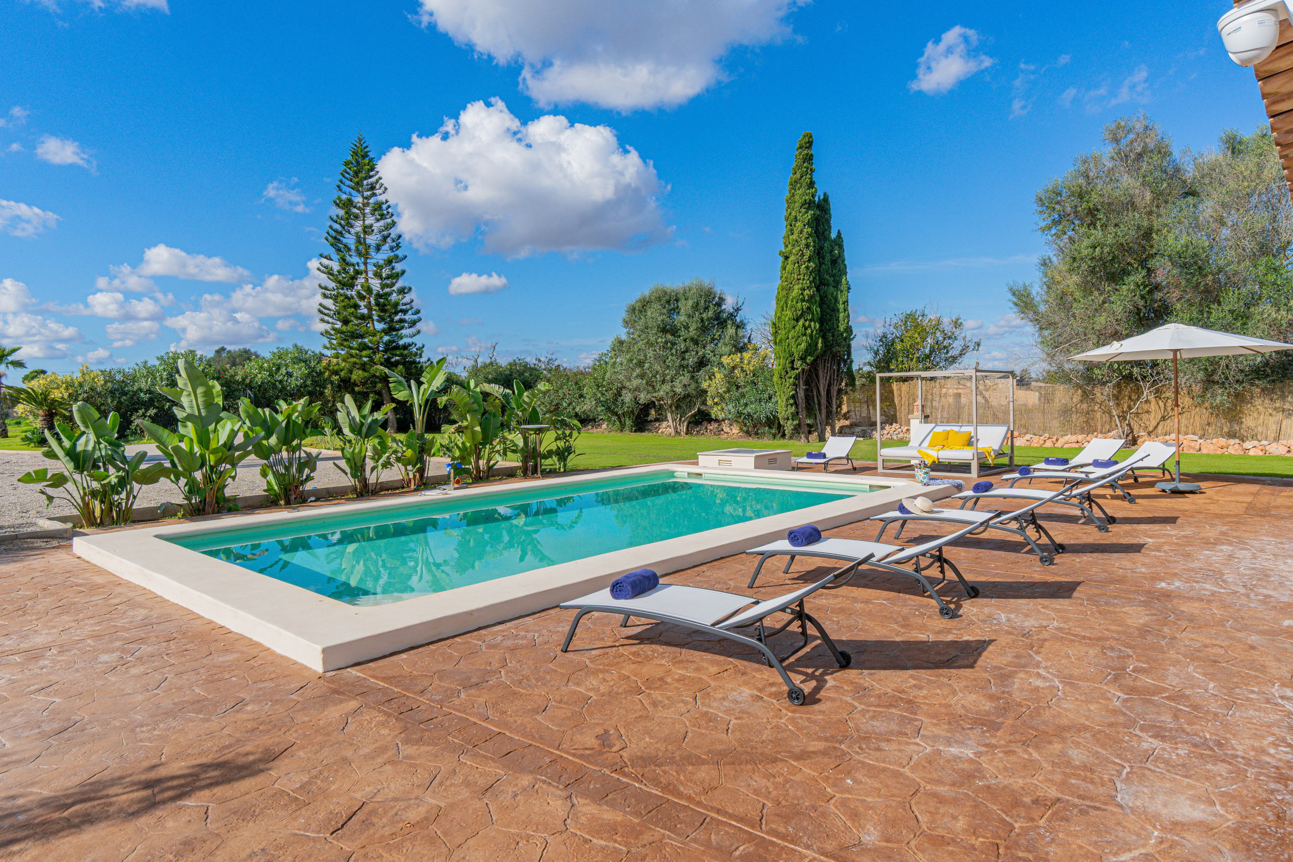 La villa cuenta con una espectacular piscina exterior de cloro de 7 x 3 metros, con una profundidad que varía entre 0.5 y 1.75 metros, adaptada tanto para niños como para adultos. Rodeada de una amplia zona de solárium con hamacas, es el lugar perfecto para relajarse bajo el sol mallorquín. El jardín, meticulosamente cuidado, ofrece un ambiente sereno y privado. Además, dispone de un porche rústico amueblado, ideal para comidas al aire libre o disfrutar de una barbacoa en familia o con amigos. Para mayor comodidad, la propiedad incluye un baño exterior y una ducha exterior. Los más pequeños tendrán su propio espacio de diversión en el parque infantil con tobogán. El aparcamiento es gratuito y se encuentra en el exterior de la finca.