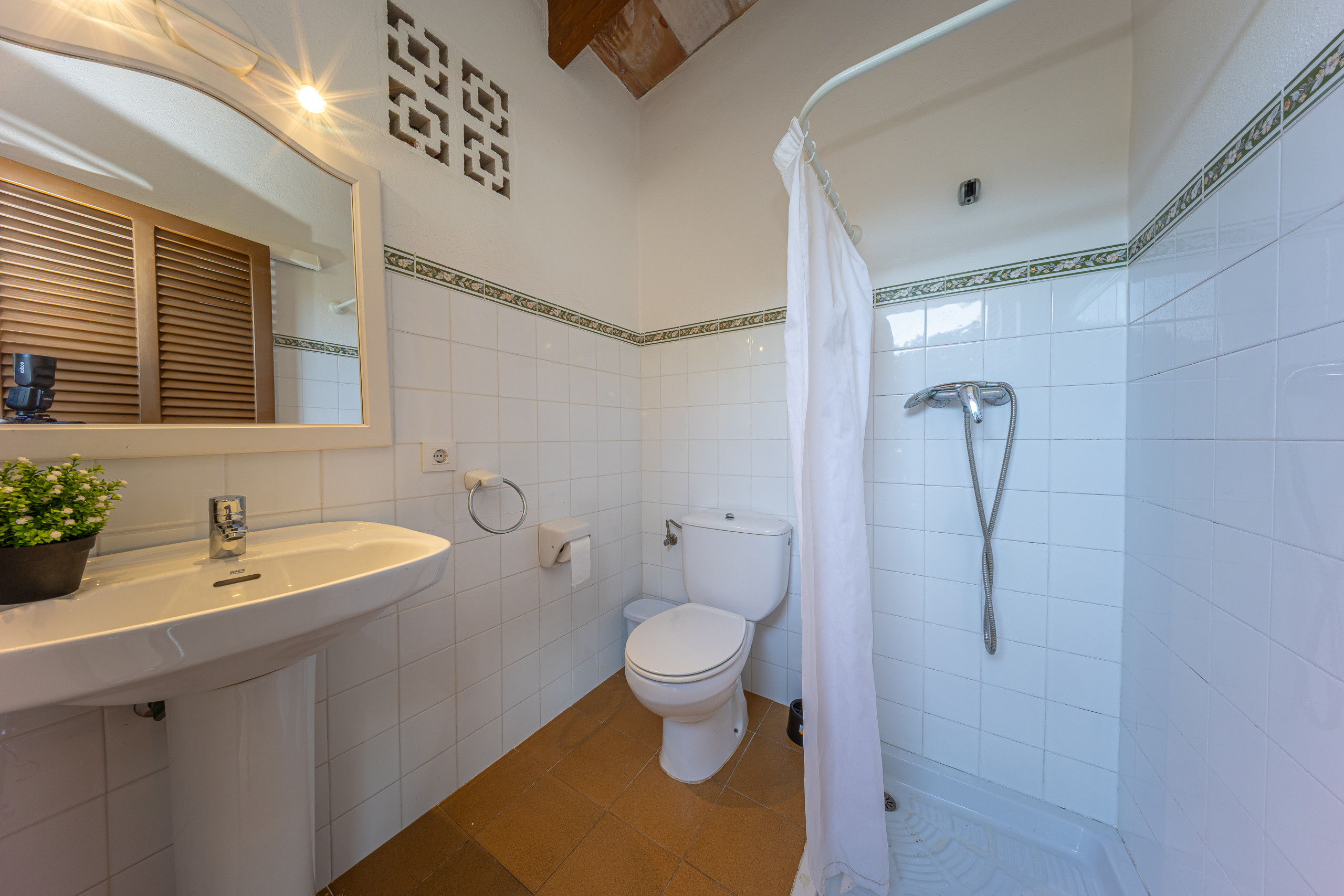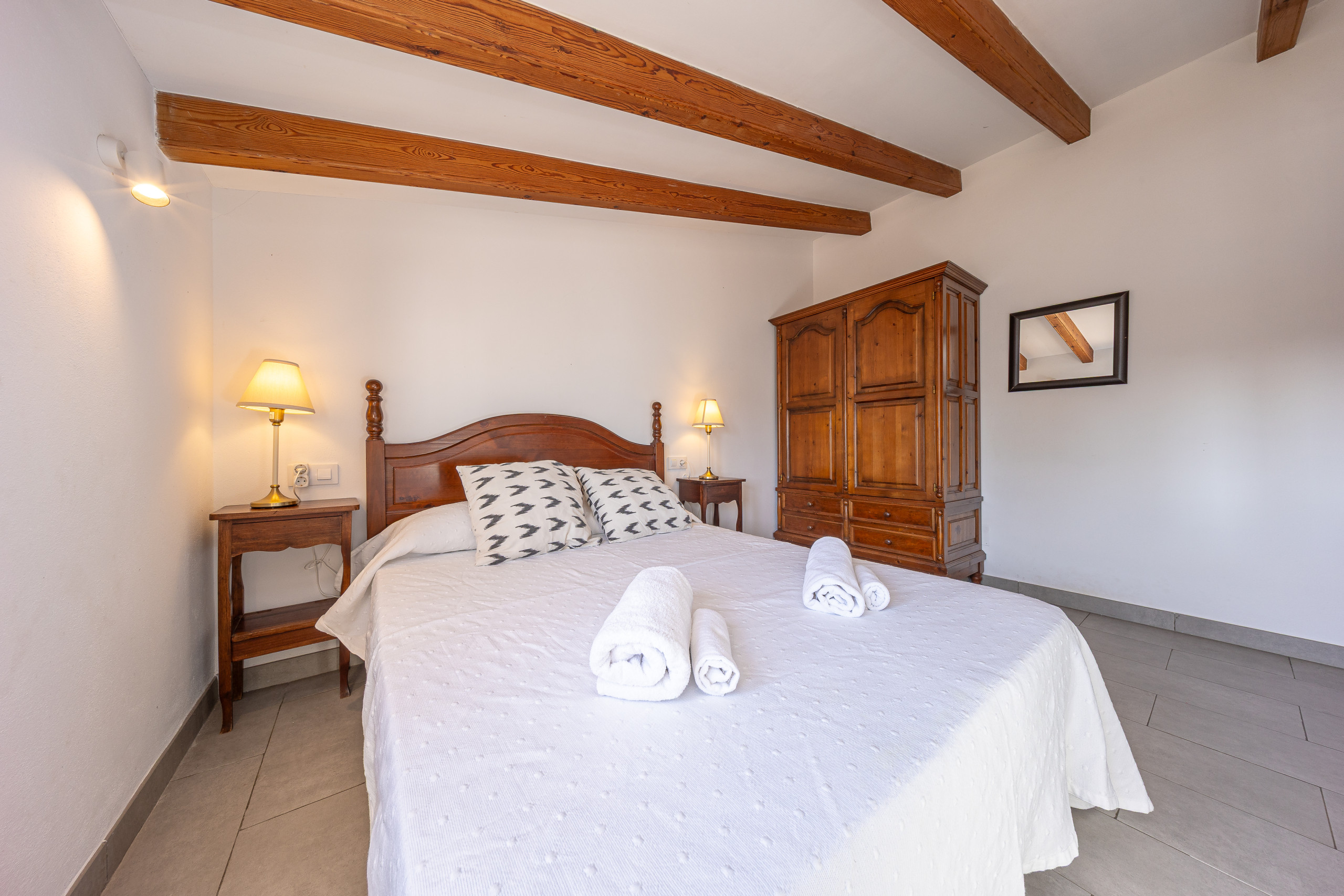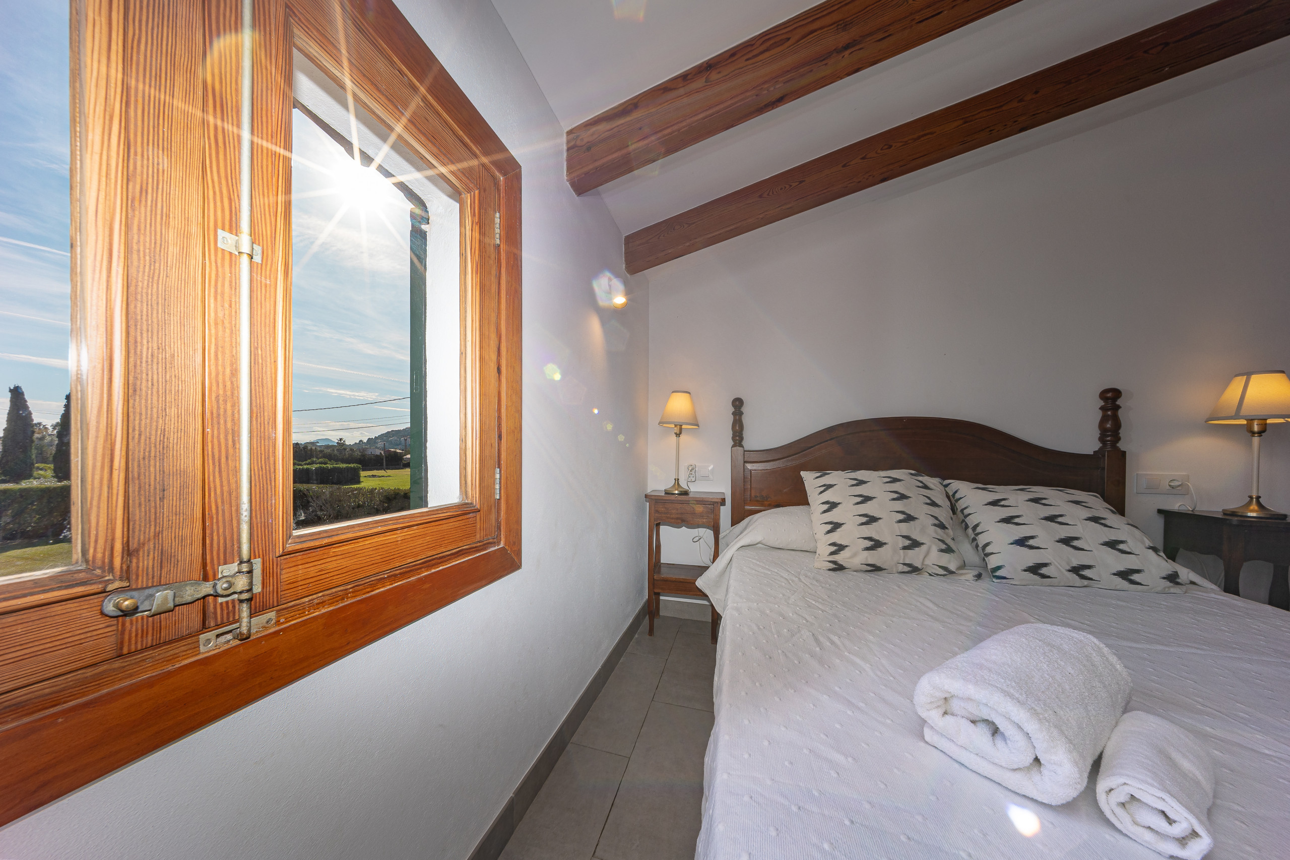 En el interior, la casa desprende el auténtico encanto de Mallorca: Los techos del salón y los dormitorios están decorados con vigas de madera típicas del Mediterráneo. La cocina independiente está totalmente equipada y no deja nada que desear.